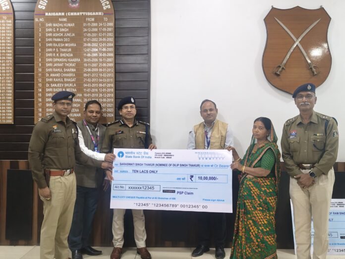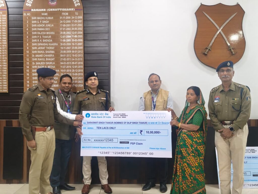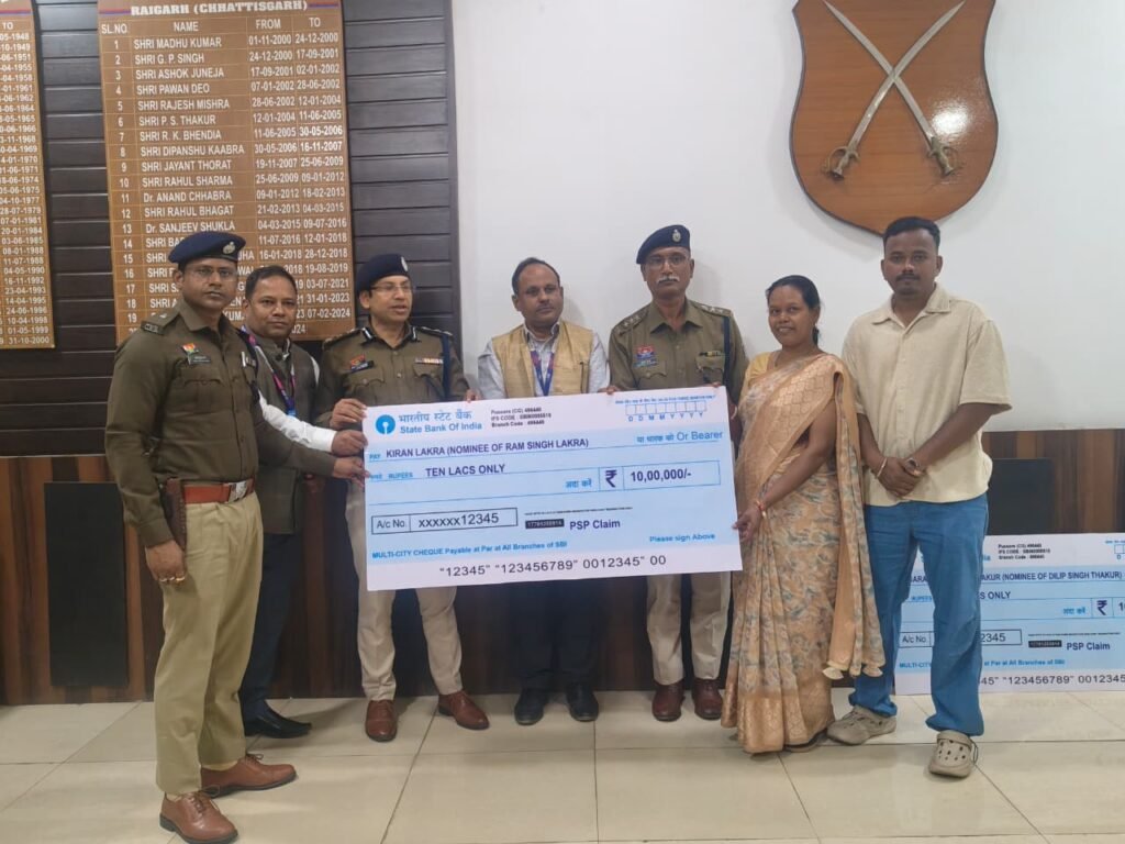 रायगढ़, 3 फरवरी । ड्यूटी के दौरान आकस्मिक निधन होने पर जिले में पदस्थ स्वर्गीय प्रधान आरक्षक दिलीप ठाकुर की पत्नी श्रीमती सरस्वती सिंह ठाकुर एवं जीआरपी थाने में पदस्थ स्वर्गीय राम सिंह लकड़ा की पत्नी श्रीमती किरण लकड़ा को पुलिस सैलरी पैकेज के अंतर्गत 10–10 लाख रुपये की बीमा राशि का चेक प्रदान किया गया। यह सहायता राशि वरिष्ठ पुलिस अधीक्षक शशि मोहन सिंह एवं एसबीआई शाखा पुसौर के प्रबंधक द्वारा सौंपते हुए शोकसंतप्त परिवारों के प्रति गहरी संवेदना व्यक्त की गई।