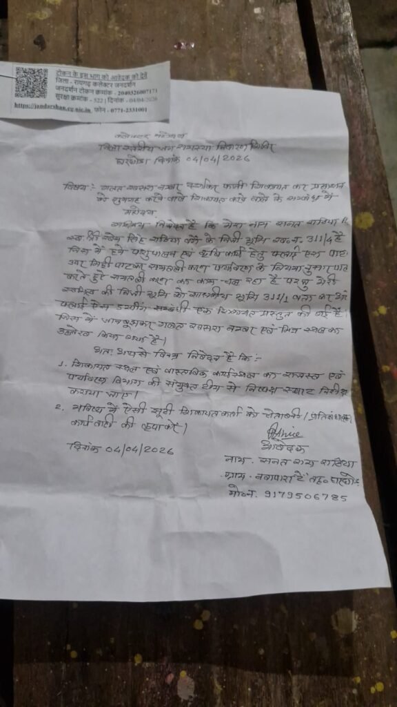 जमीन मालिक के द्वारा जिला स्तरीय जन समस्या निवारण शिविर में की गई शिकायत।