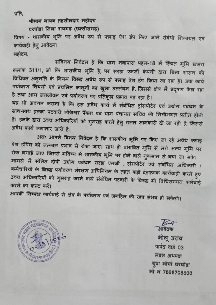रायगढ़ =रायगढ़ में एक निजी भूमि पर फ्लाई ऐश (राख) डंपिंग के मामले में स्थानीय भाजपा मंडल अध्यक्ष युवा मोर्चा एवं घरघोड़ा वार्ड नं ३ का पार्षद के द्वारा उसे शासकीय भूमि खसरा नंबर ३११/१ जो शासकीय मद में दर्ज है को बताकर शिकायत दर्ज कराने का मामला सामने आया है। घरघोड़ा ब्लॉक के नवापारा पंचायत में शासकीय भूमि पर शारदा मिनरल्स दर्रामुड़ा से निकलने वाले फ्लाई ऐश को अवैध रूप से डंपिंग करने का आरोप लगाया गया है ।भाजपा मंडल अध्यक्ष युवा मोर्चा भोलू उरांव इस मामले में नयाब तहसीलदार घरघोड़ा को शिकायत कर कार्यवाही की मांग की गई ।